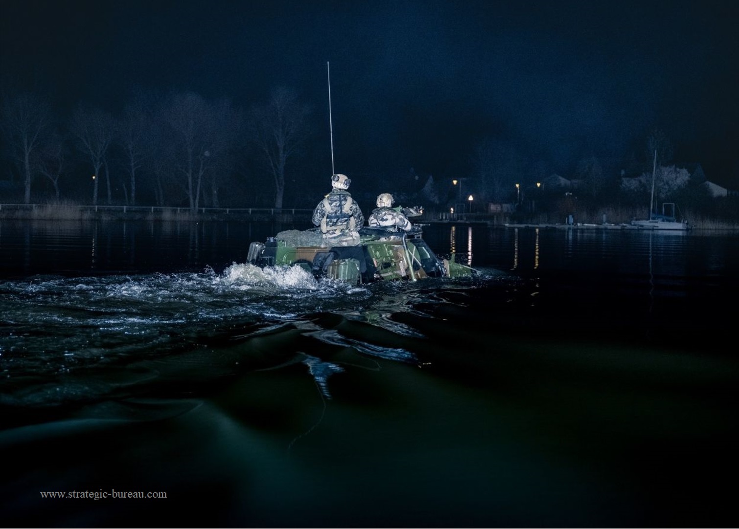 Franchissement amphibie en VBL, Véhicule Blindé Léger, de l’armée française, dans les conditions nocturnes.